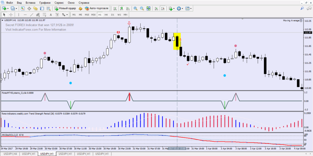 | Systems Cyde | Это комплексный индикатор, который состоит из двух частей. Первая часть 一 это стрелки и круги на графике. Вторая часть一 это столбиковая гистограмма, вынесенная в отдельное окно под график. | Это готовая торговая система, построенная на определении разворотных рыночных зон. Индикатор сам определяет разворотный участок и показывает трейдеру точку входа.