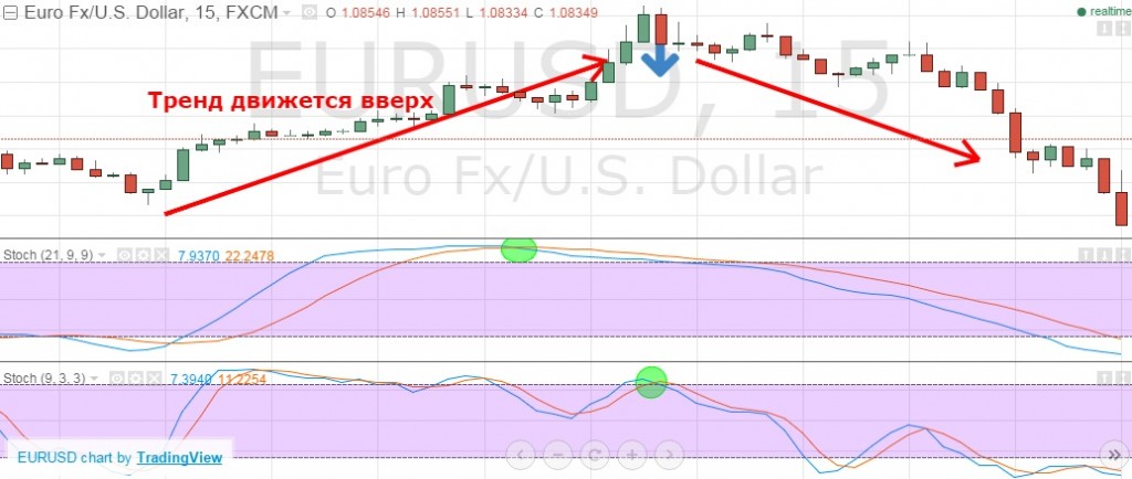 • Стохастик (двадцать один, девять, девять) снижается в зону перепроданности (ниже двадцати), при этом пересекается и изменяет сторону движения.